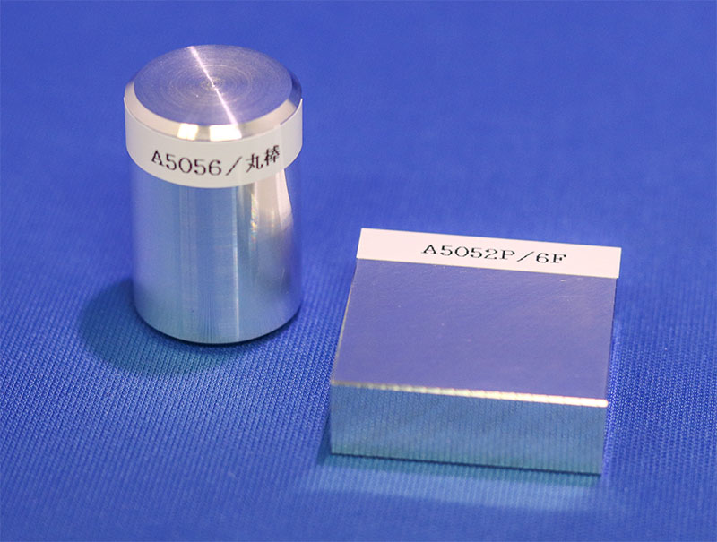 A5056A5052に性質が似ていますが、A5052より高い強度を持つアルミニウム合金です。丸棒の形状での流通量が多く、機械構造部品や精密部品など、強度と加工性が求められる部品に用いられます。 |